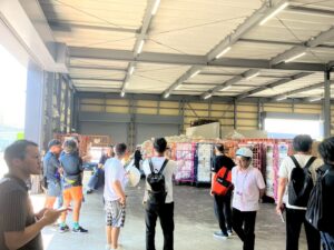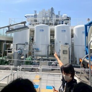 午前中は各自でパビリオン観覧や会場内散策、昼食後はグループに分かれ、万博会場のバックヤードにある廃棄物のメイン及びサブストックヤードを一廃協事務局長、廃棄物処理受注組合の万博業務事務局から説明を受けながら見学しました。また、施設管理をされている部員の協力により、大阪ガスのメタネーション実証設備「化けるLABO(ラボ)」見学も実現し、生ごみから都市ガスの主原料メタンを作る過程について視覚的に分かりやすいAR技術を体験しながら説明を受けました。